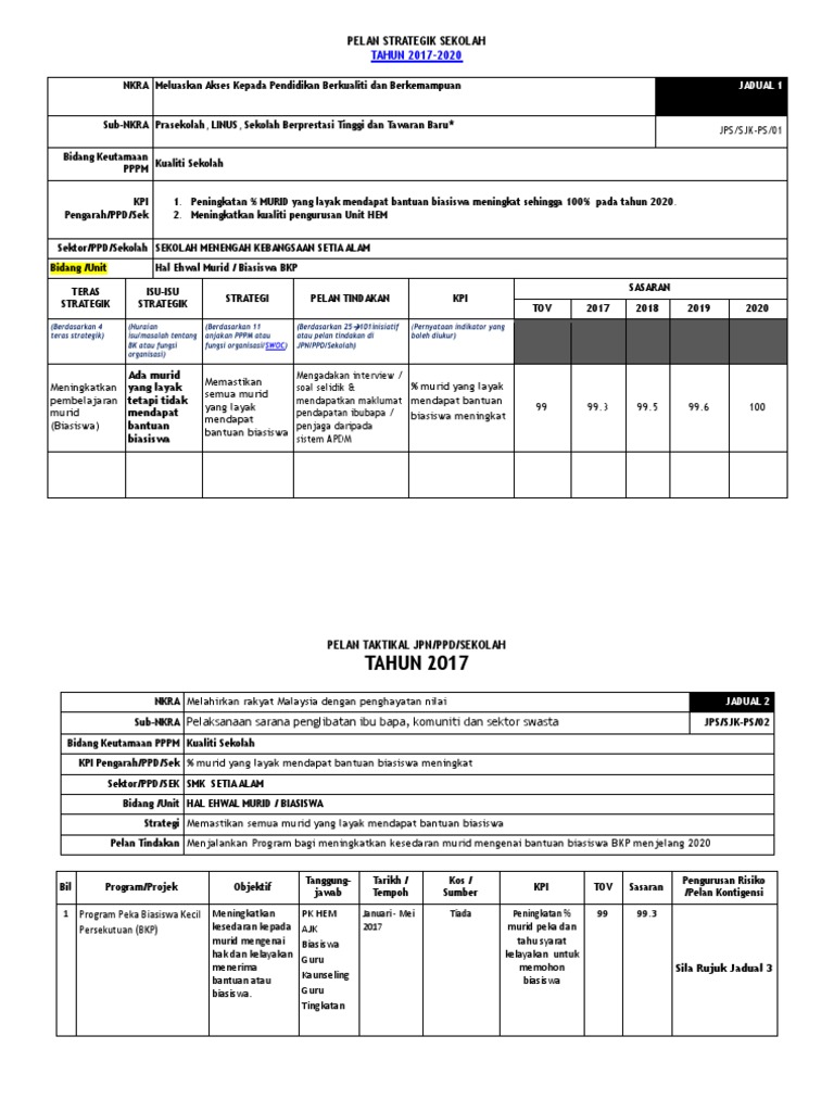 Jabatan Perkhidmatan Awam Negeri Sabah telah merangka pelan strategik bagi tempoh lima 5 tahun 2018-2022 yang menumpukan kepada jentera pemodenanan dan penerapan budaya berprestasi tinggi kepada modal insan dan organisasi perkhidmatan awam negeri melalui empat 4 teras perancangan yang strategik. MUKASURAT 66 9 NOV 2009 PELAN STRATEGIK BIDANG HEM TAHUN 2010-2014 64 PELAN OPERASI JAWATANKUASA BIASISWA 2010-2014 Nama Projek. Membantu pelajar yang berdaftar mendapatkan penaja sama ada dalam bentuk biasiswa atau pinjaman dengan memaklumkan segala maklumat terkini.